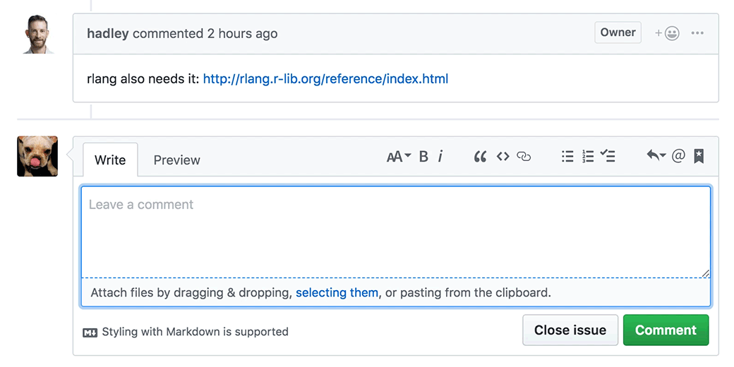 For the purposes of this post, let’s suppose you’ve found a bug or there’s a feature you’d like to see added to one of your favourite packages. Being the thoughtful user that you are, you’ve made your way to the appropriate GitHub repo. Before writing anything, you search the existing issues to see if it’s already there, or perhaps you’ve landed yourself in the open issue by way of searching for your error message. The point is: you have an issue, and you’re not alone — someone’s beat you to the punch/blazed a trail ahead of you.