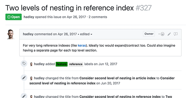 Contributions to the tidyverse, and to open source software in general can be framed as various forms of “feedback.” Giving useful feedback can be hard! That’s one of the reasons that File issues is part of our contributing guide. Hopefully, it’s a mutually-beneficial endeavor — if you’ve found a bug while getting help, we want to know about it so we can improve the software.