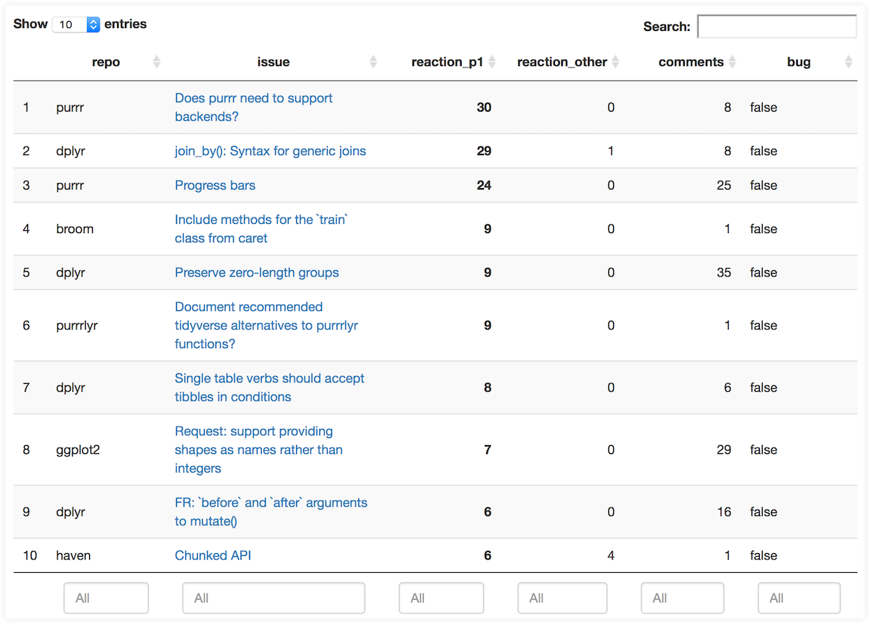 Feedback that falls on deaf ears isn’t worth much, so we’ve started tracking these using the gh package and GitHub’s API.