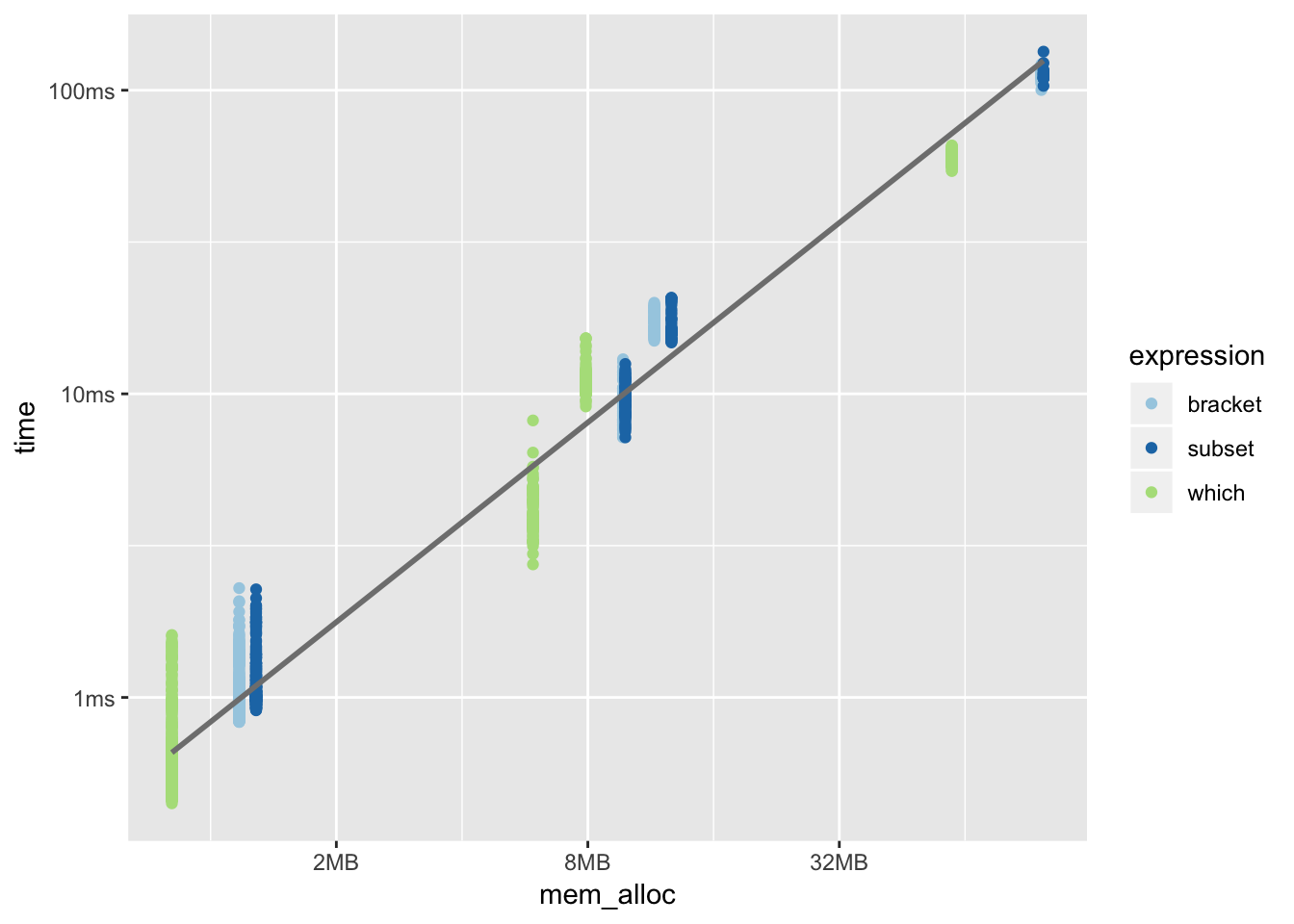 ggplot(aes(x = mem_alloc, y = time, color = expression)) +