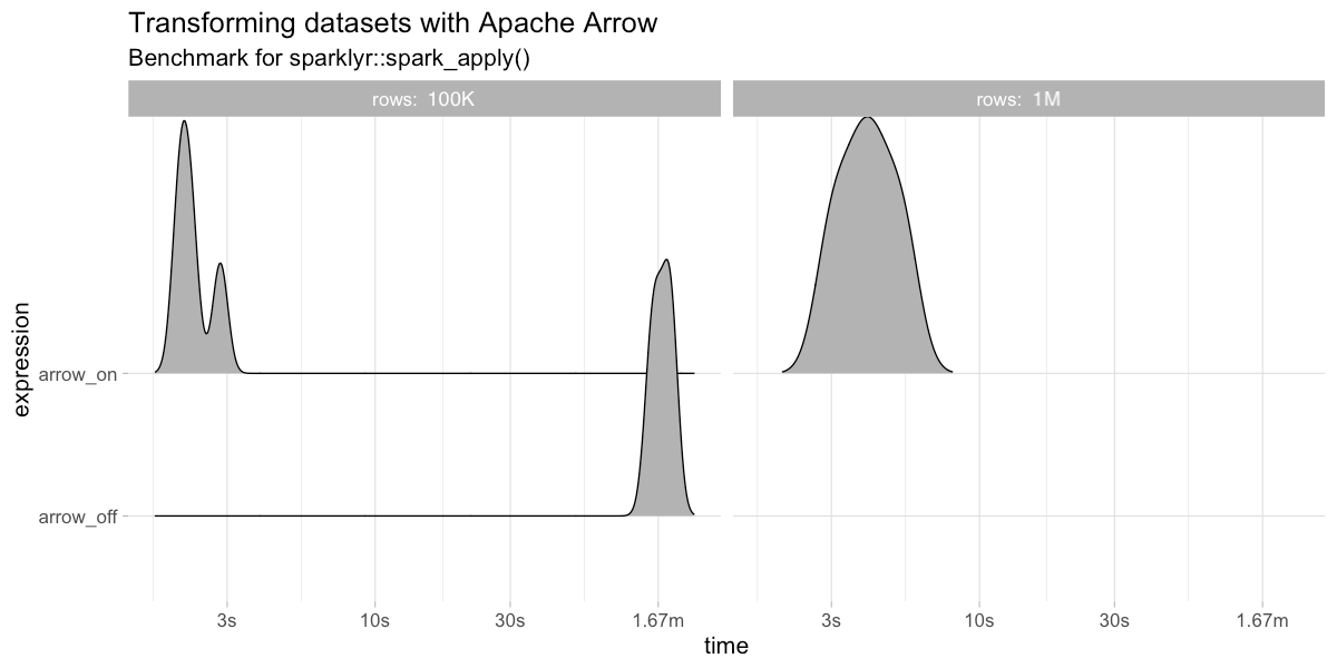 In practice, this means faster data transfers and support for larger datasets; specifically, this improves collect(), copy_to() and spark_apply(). The following benchmarks make use of the