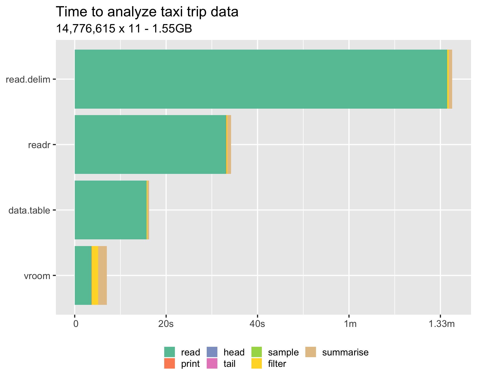 vroom is fast, but how fast? We benchmarked vroom using a real-world dataset of taxi-trip data, with 14.7 million rows, 11 columns. It contains a mix of numeric and text data, and has a total file size of 1.55 GB.
