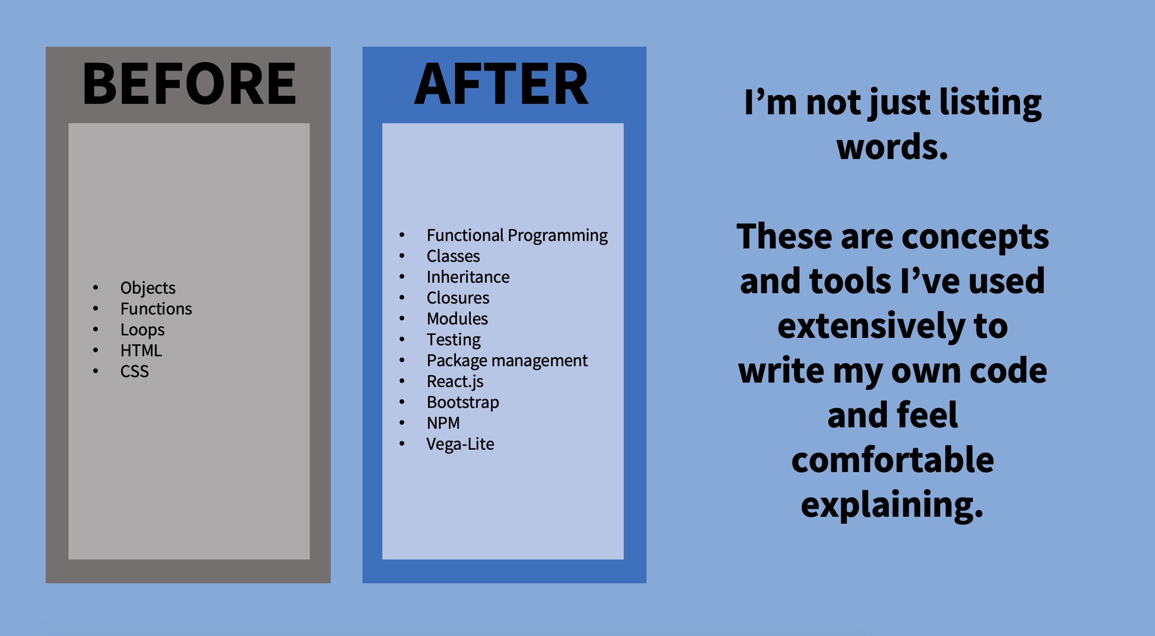 Enter the TidyBlocks project. I remember in my interview telling Greg Wilson my primary goal for the summer: to know more about JavaScript. When applying, I felt comfortable with as much JavaScript as you’d find in the first chapter of any book: arrays, lists, strings, and basic operations. I also had created some d3.js visualizations by Frankenstein-ing open source code snippets together. I was reading a lot about coding but hadn’t written much. I certainly never started a project from nothing.