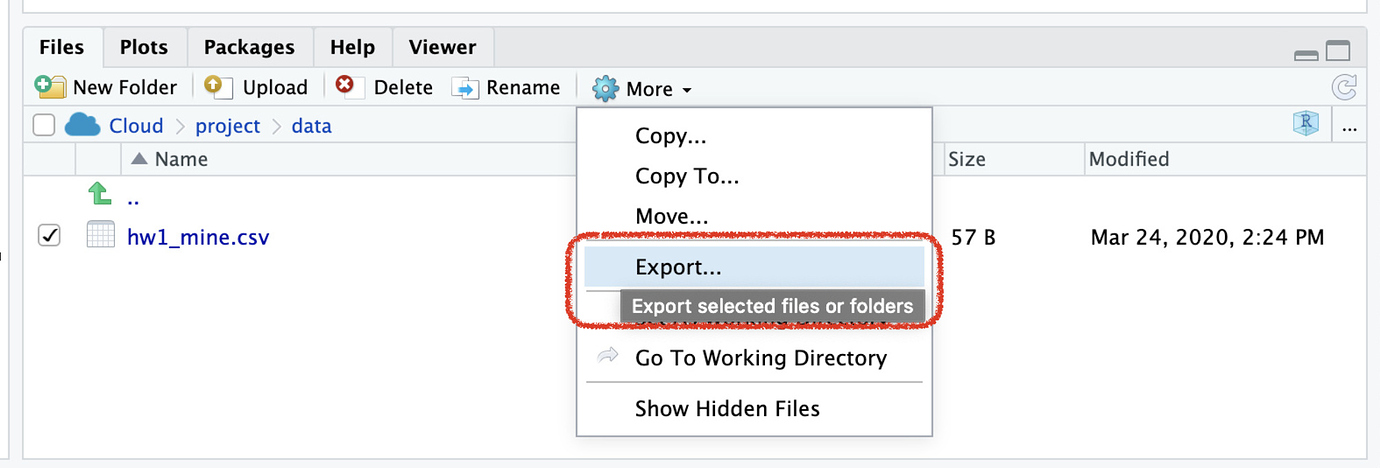 One option is is to export and download the file from rstudio.cloud. In the example below, I’ve checked the csv file I want to download, clicked “More”, then Export. If multiple files are selected, they are combined into a zip file.