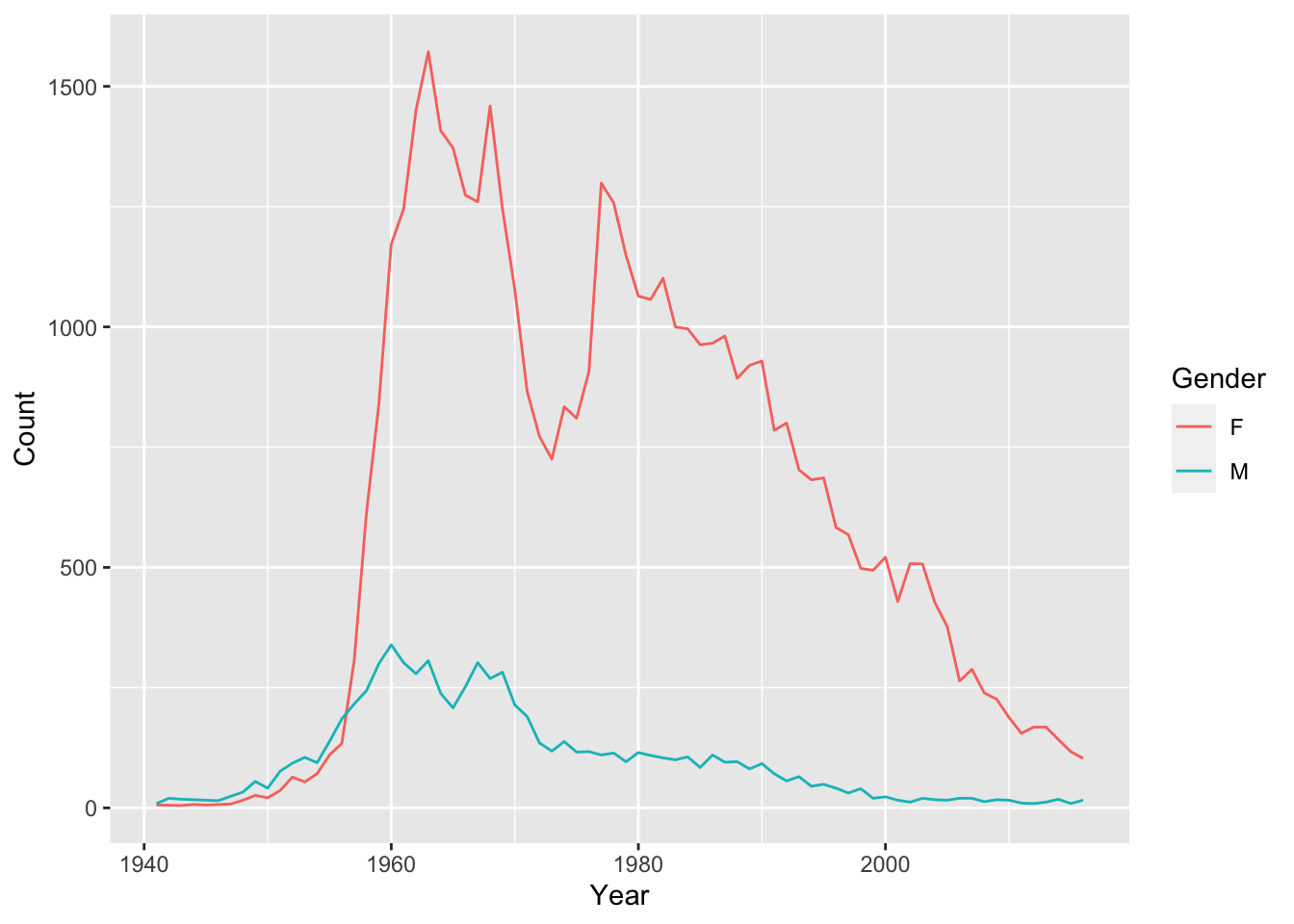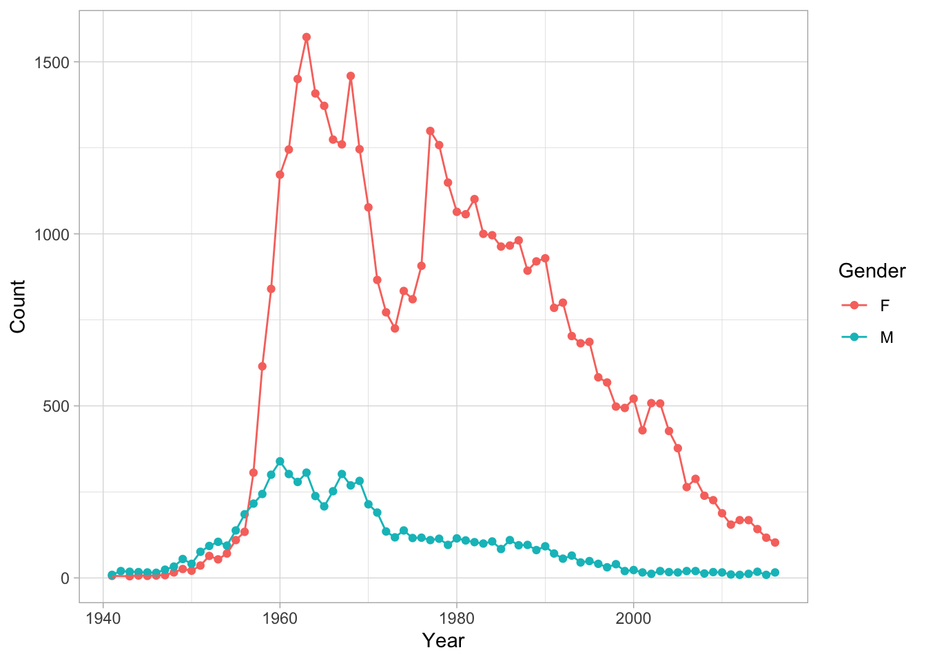 ggplot(aes(x = Year, y = Count, color = Gender)) +