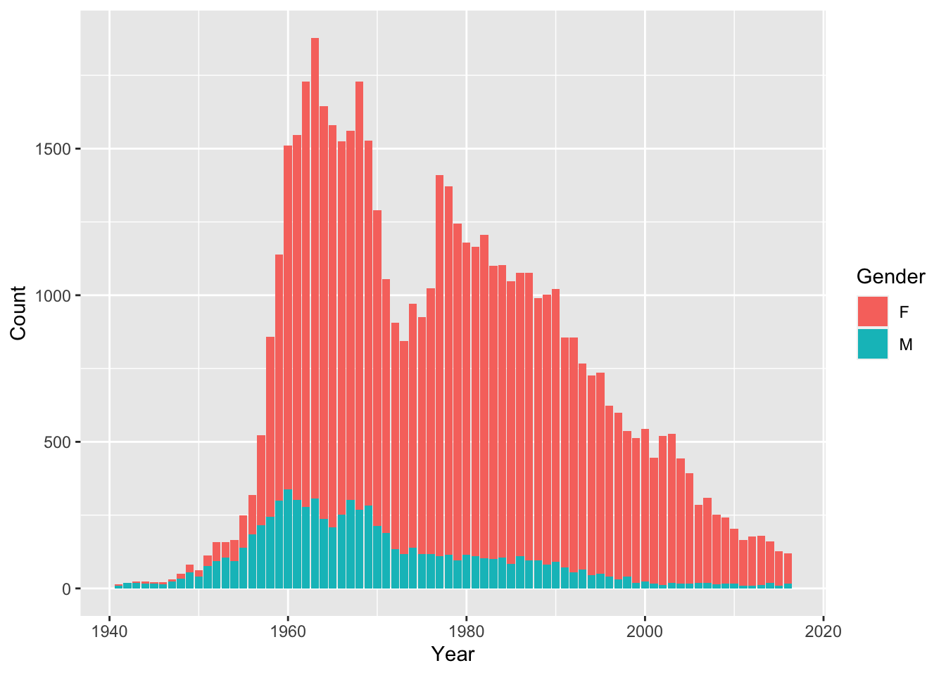 ggplot(aes(x = Year, y = Count, fill = Gender)) +