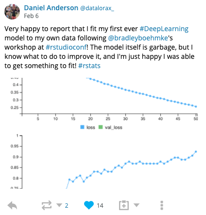 This year I had the opportunity to teach the Deep Learning with Keras and TensorFlow in R workshop . The workshop had max capacity attendence and was sold out within the first couple of months of opening up; showing a strong thirst for deep learning within the R community. With unbelievable support from TAs and RStudio, the workshop was a great success.