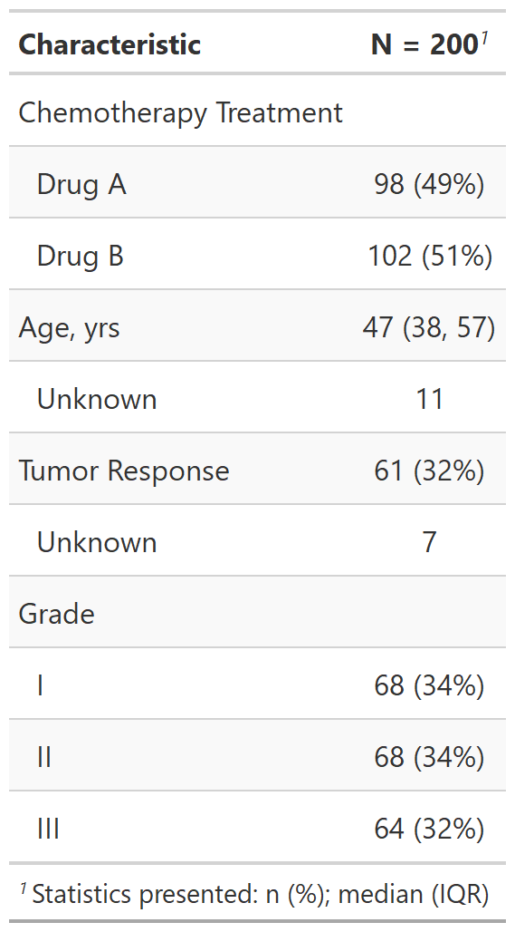 Throughout the post we will use an example dataset of 200 subjects treated with either Drug A or Drug B, with a mix of categorical, dichotomous, and continuous demographic and response data. The dataset has label attributes (using the labelled package) for column names.