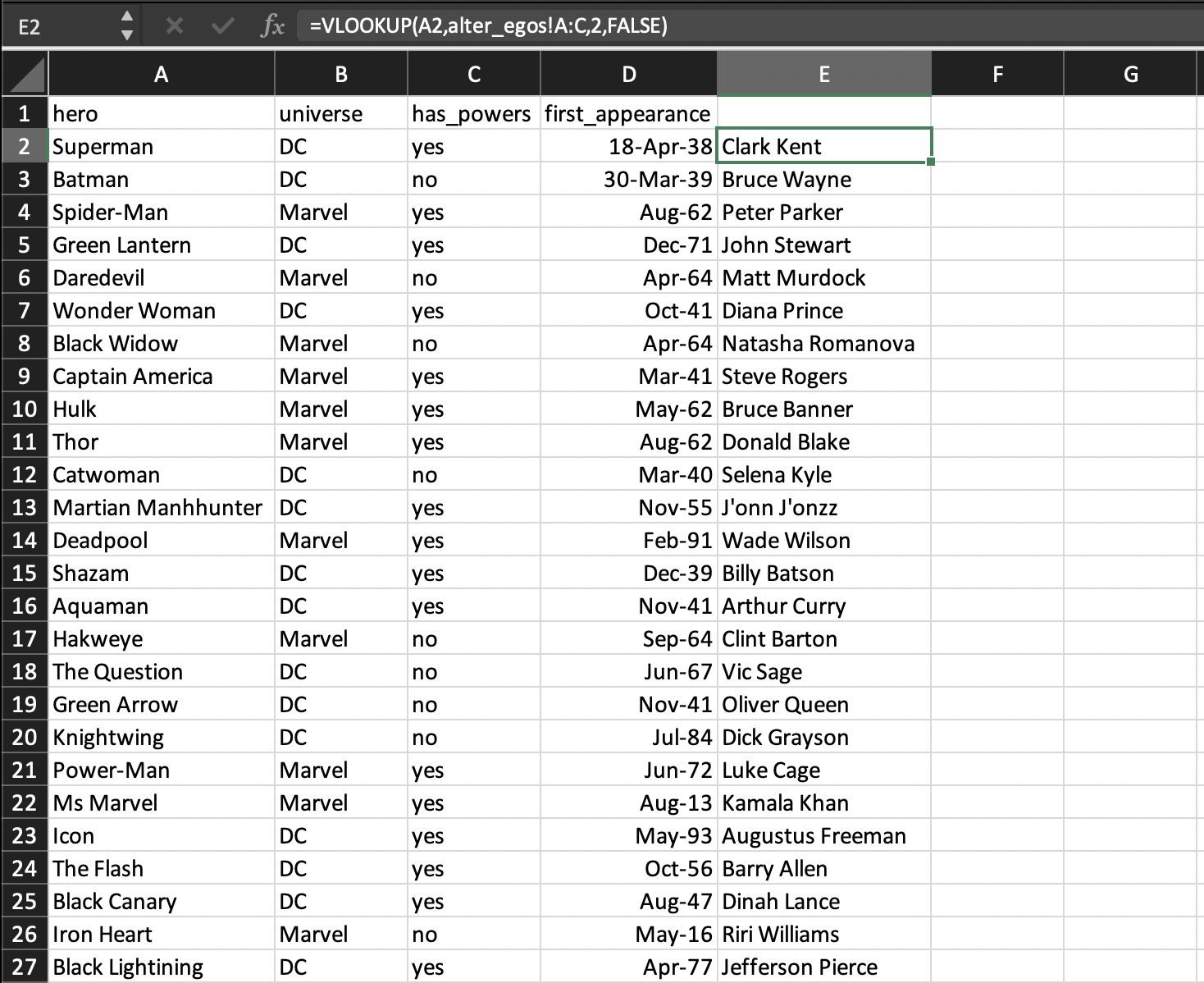 The example below shows the process of pulling the alter_ego column from our alter egos sheet into our initial heroes data set.