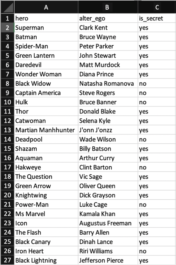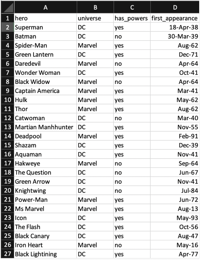 If you would like to follow along, you can download the Excel file called superheroes.xlsx