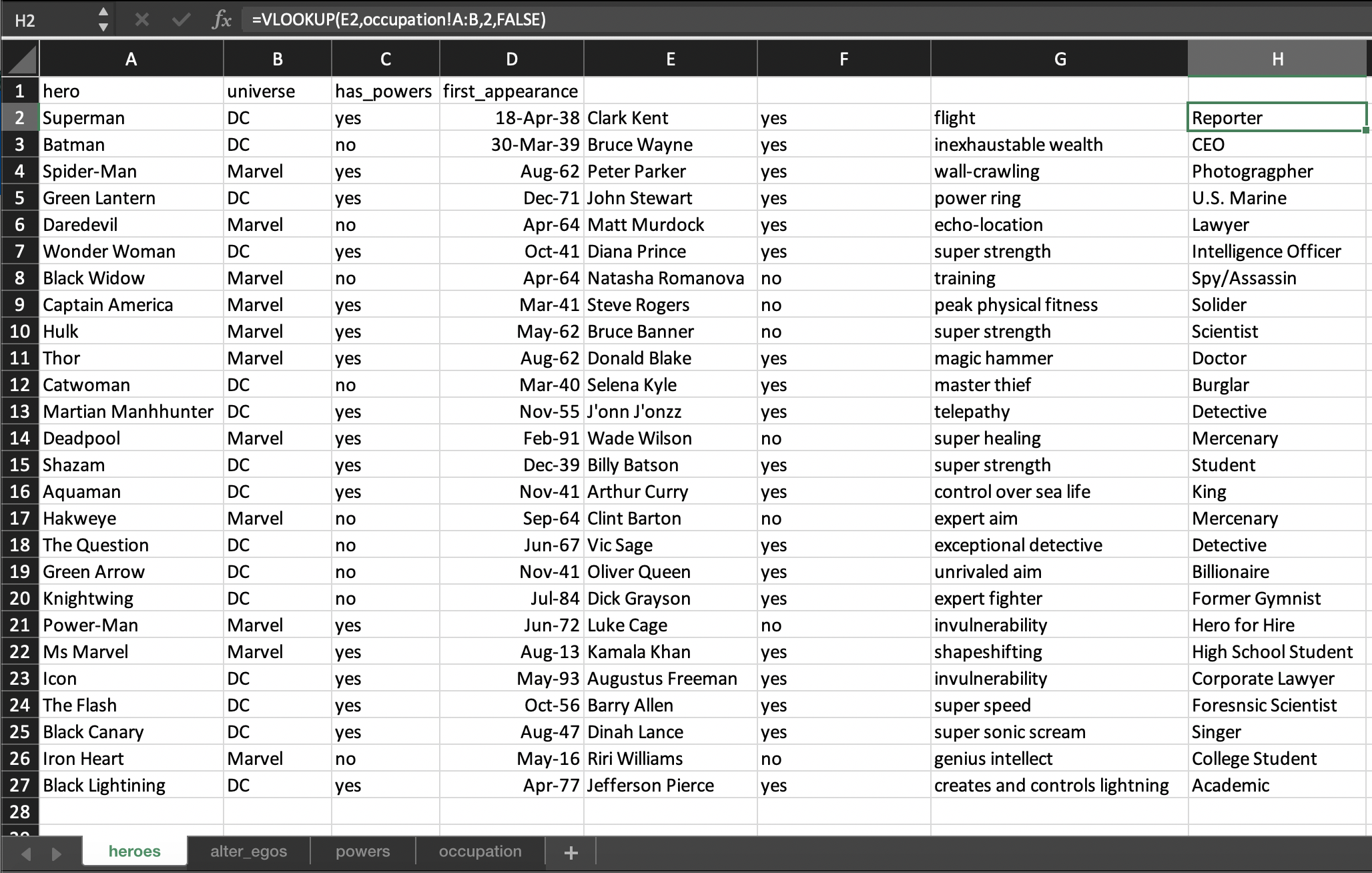 ## $ occupation <chr> "Reporter", "CEO", "Photogragpher", "U.S. Marine", "…For doing this same task in Excel, we can continue to utilize VLOOKUPS for each additional column of data we want to pull into our main sheet. To bring in our occupation data we simply adjust the initial reference point in our formula from column A2 which houses hero name to E2 which houses alter egos which was also added via a VLOOKUP.