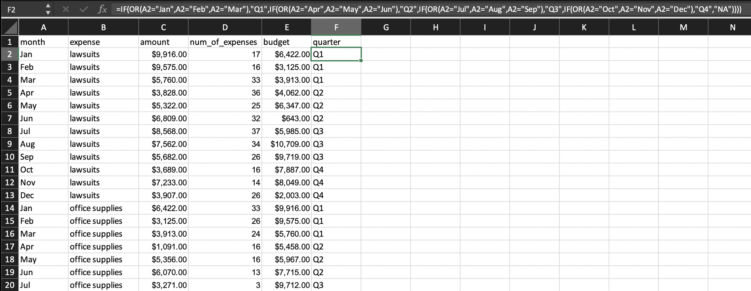 =IF(OR(A2="Jan",A2="Feb",A2="Mar"),"Q1",IF(OR(A2="Apr",A2="May",A2="Jun"),"Q2",IF(OR(A2="Jul",A2="Aug",A2="Sep"),"Q3",IF(OR(A2="Oct",A2="Nov",A2="Dec"),"Q4","NA"))))For our tidyverse comparison, When creating a column that requires multiple or nested logical conditions, we can take advantage of the case_when() function from dplyr.