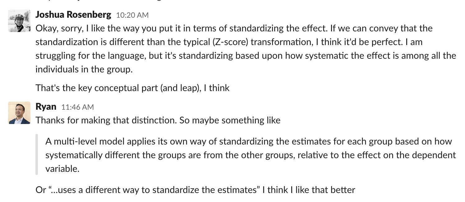 We read through the chapter and picked out sections that didn’t seem clear. Then, we had conversations to clarify how standardizing coefficients work in multilevel models. We wrote out some initial thoughts to convey where we-together-ended up in our conversation. Then, we read the section again. And round and round we went, until finally we arrived at an execution we were happy with.