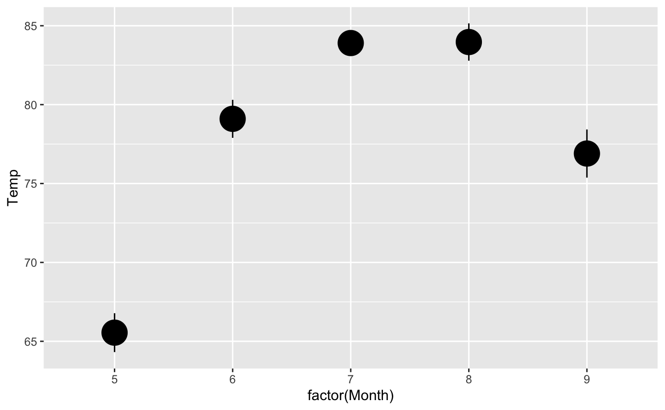 geom_pointrange(aes(x = factor(Month), y = Temp), stat = "summary", size = 2)