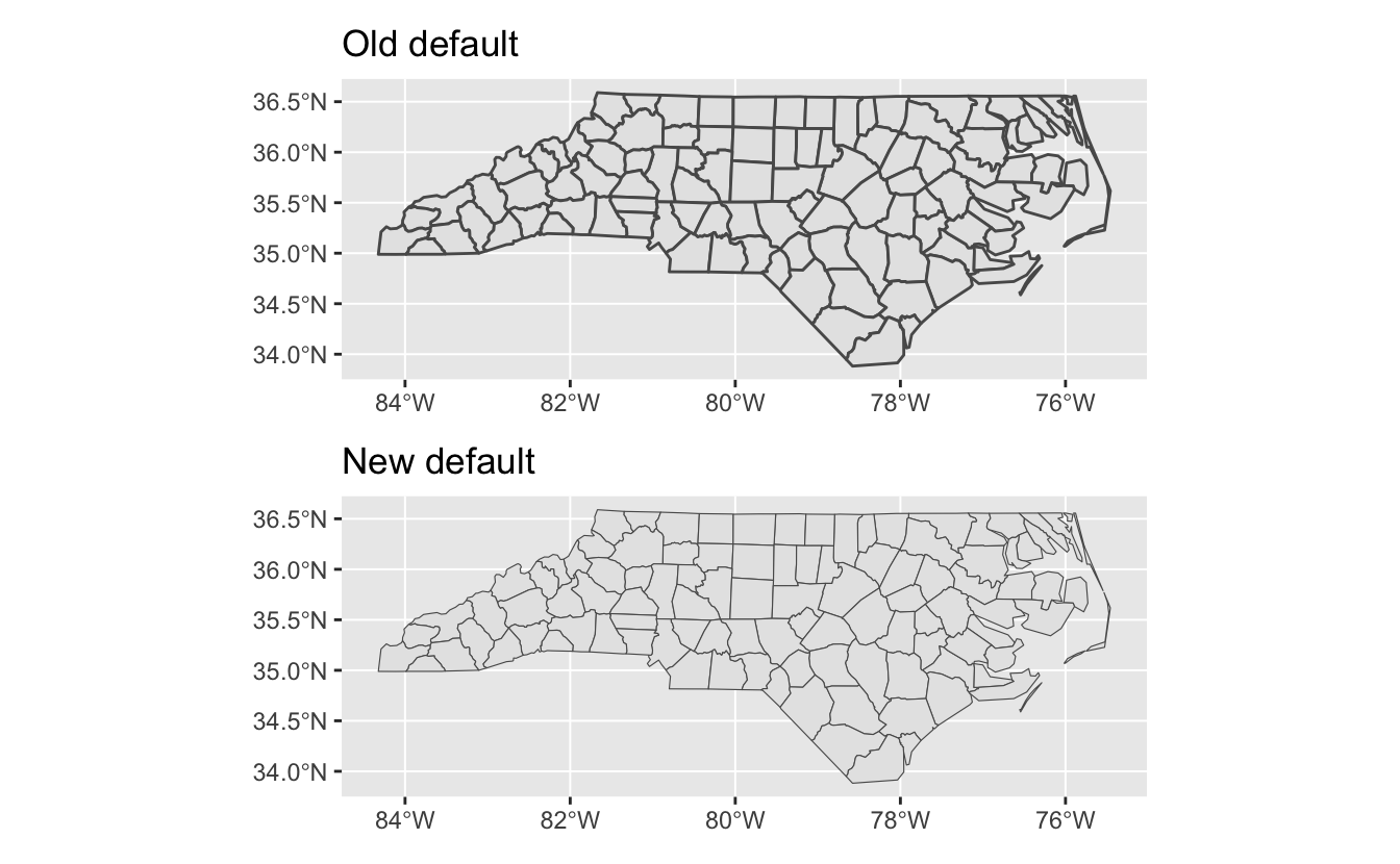 . The change came about as we already had induced visual changes to old code due to the linewidth aesthetic introduction and based on feedback from the spatial community we saw that size was most often used to thin the polygon borders. The new default is 0.2 (down from 0.5) and hopefully strikes a nice balance: