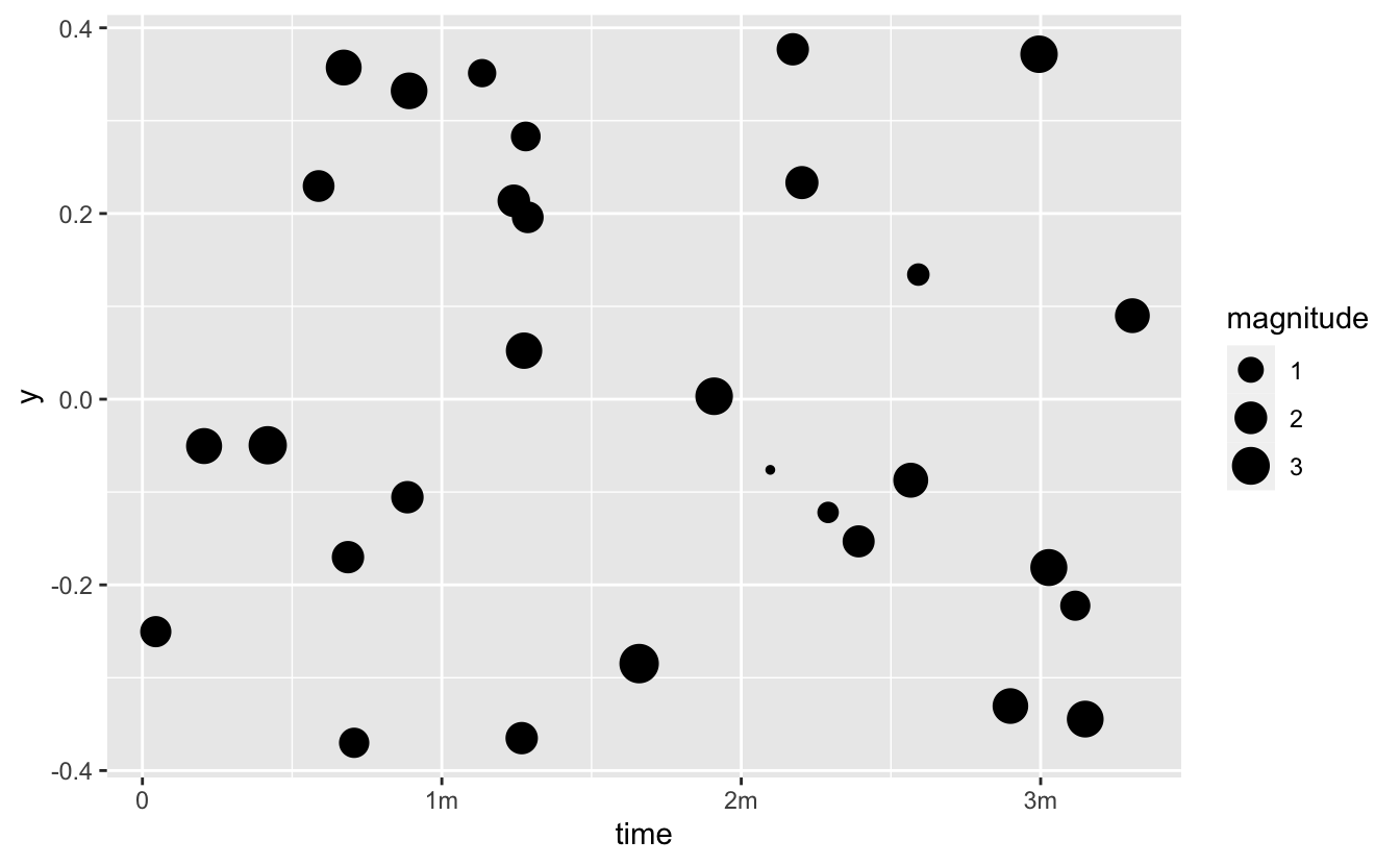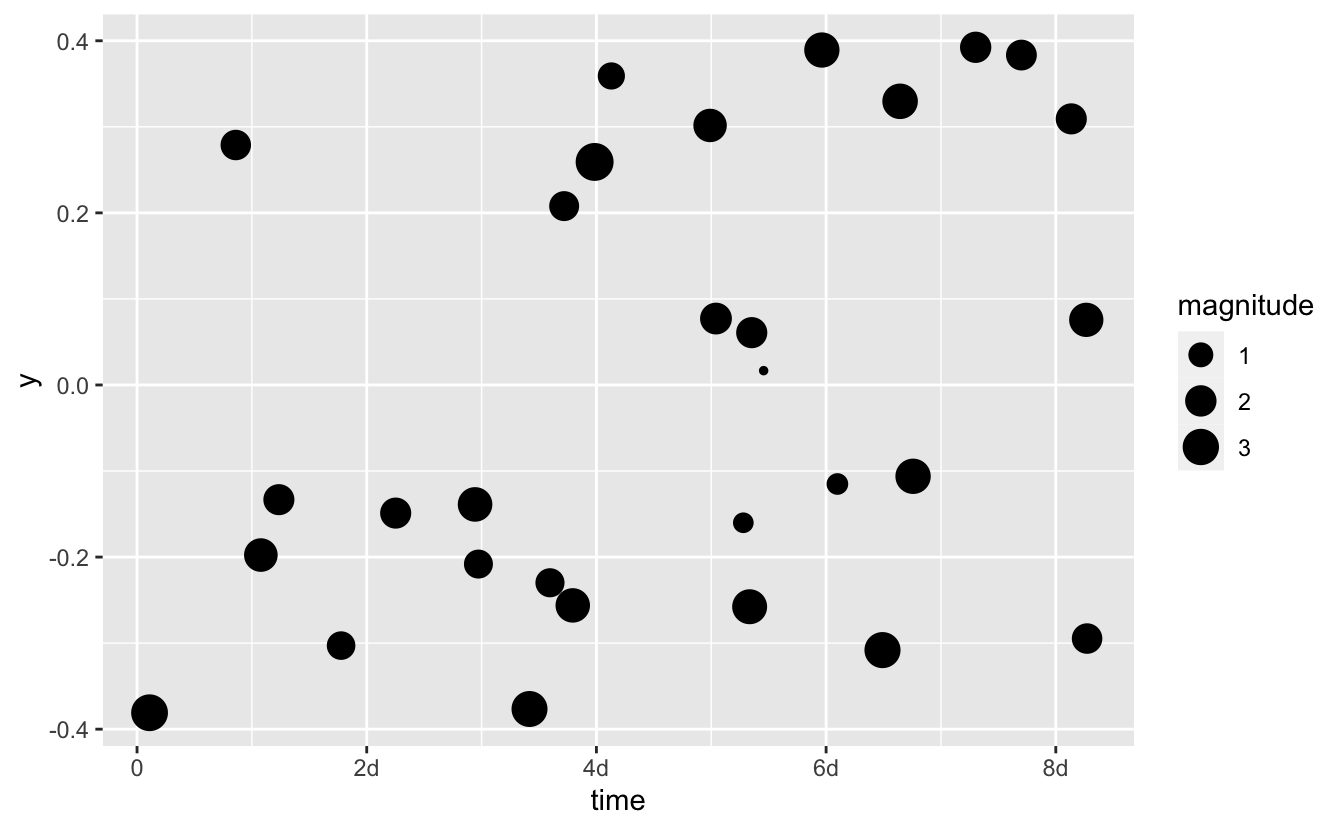 As we can see the timespan transform automatically picks the unit of the difftime object. Further it identifies that for this range, adding breaks for minutes makes most sense.