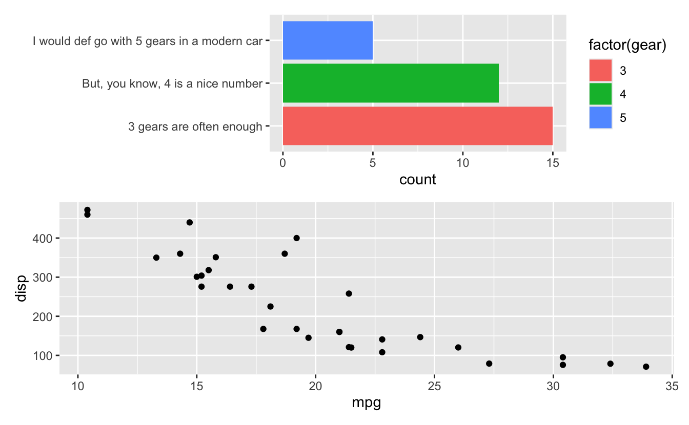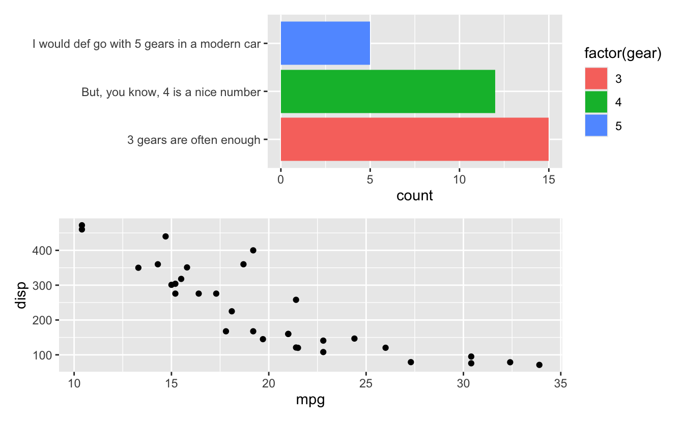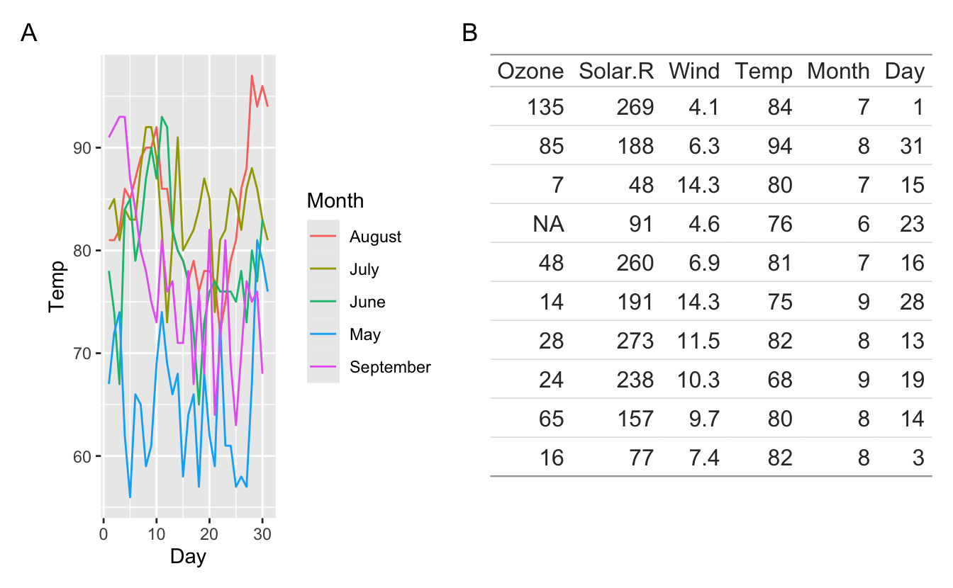 output). Also, and this is perhaps more interesting, patchwork is aware that the first row is special (a header row), and thus places that on top of the panel area so that the plot region of the left plot is aligned with the body of the table, not the full table.