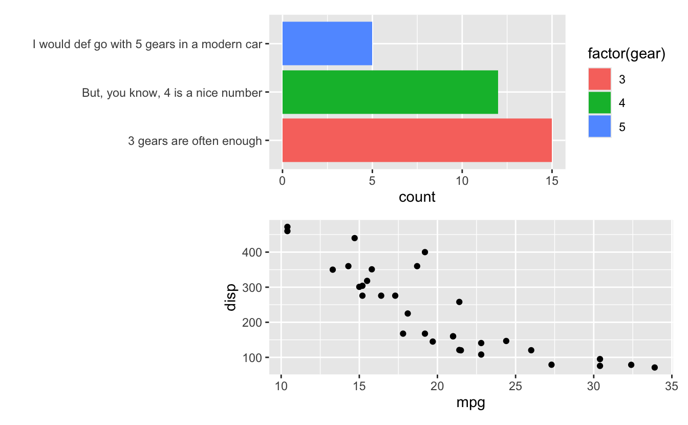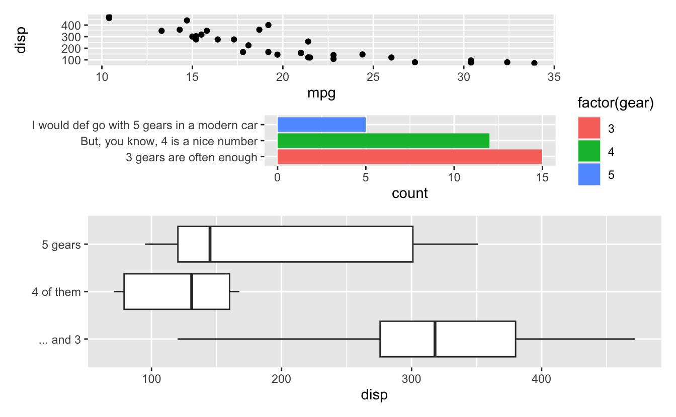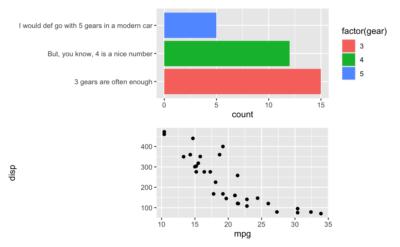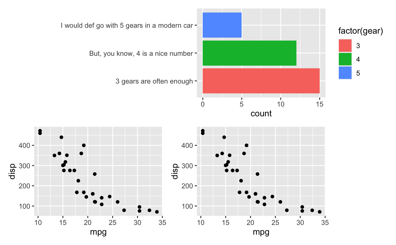 output). Also, and this is perhaps more interesting, patchwork is aware that the first row is special (a header row), and thus places that on top of the panel area so that the plot region of the left plot is aligned with the body of the table, not the full table.