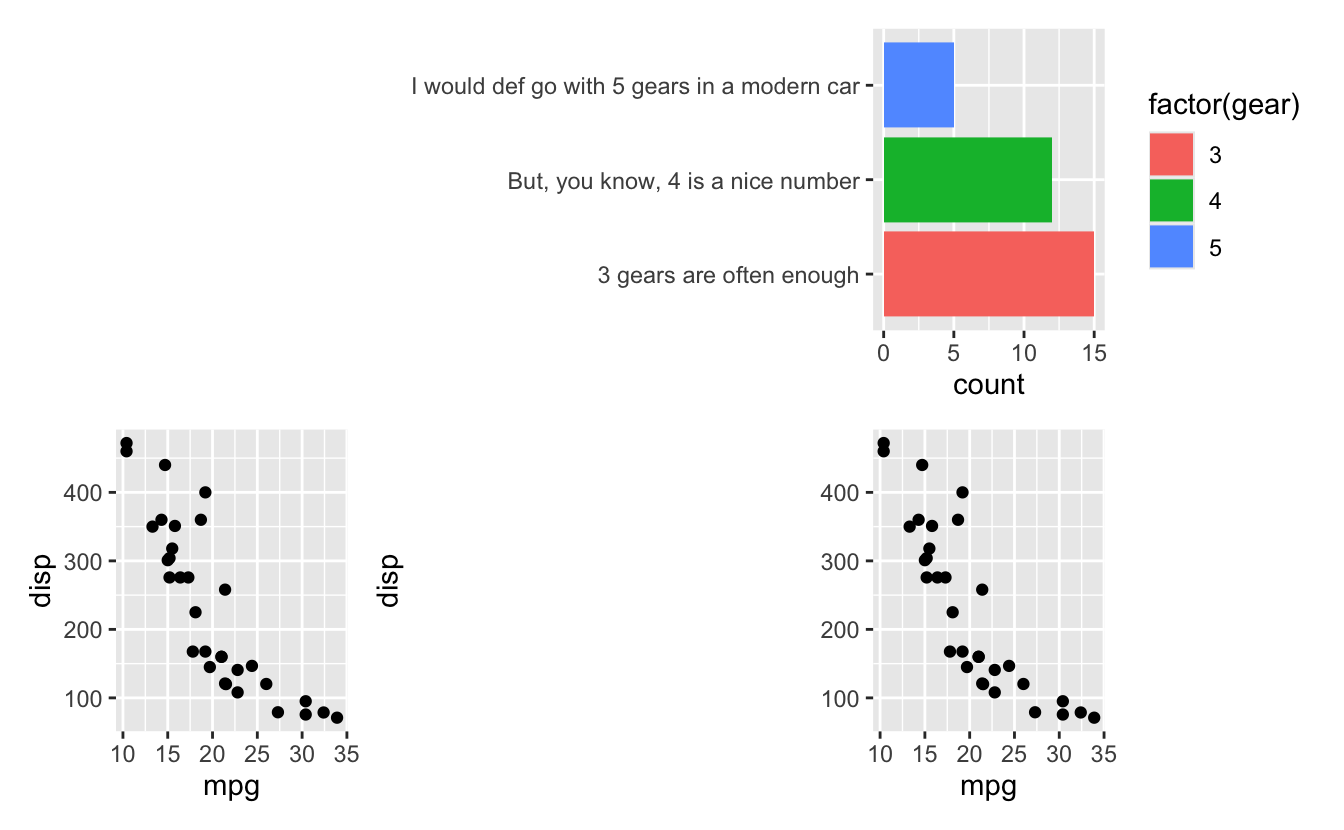 The other type is "space" which works slightly different. Using this you tell patchwork to not reserve any space for what the side(s) contain. This is perfect in situation where you already have empty space next to it that can fit the content. Consider this plot: