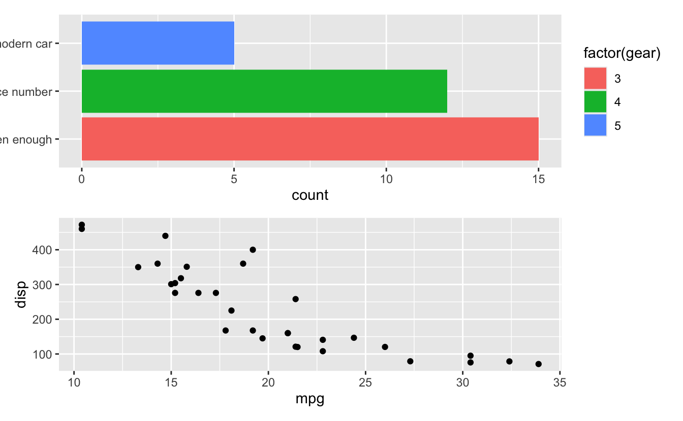 geom_bar(aes(y = factor(gear), fill = factor(gear))) +