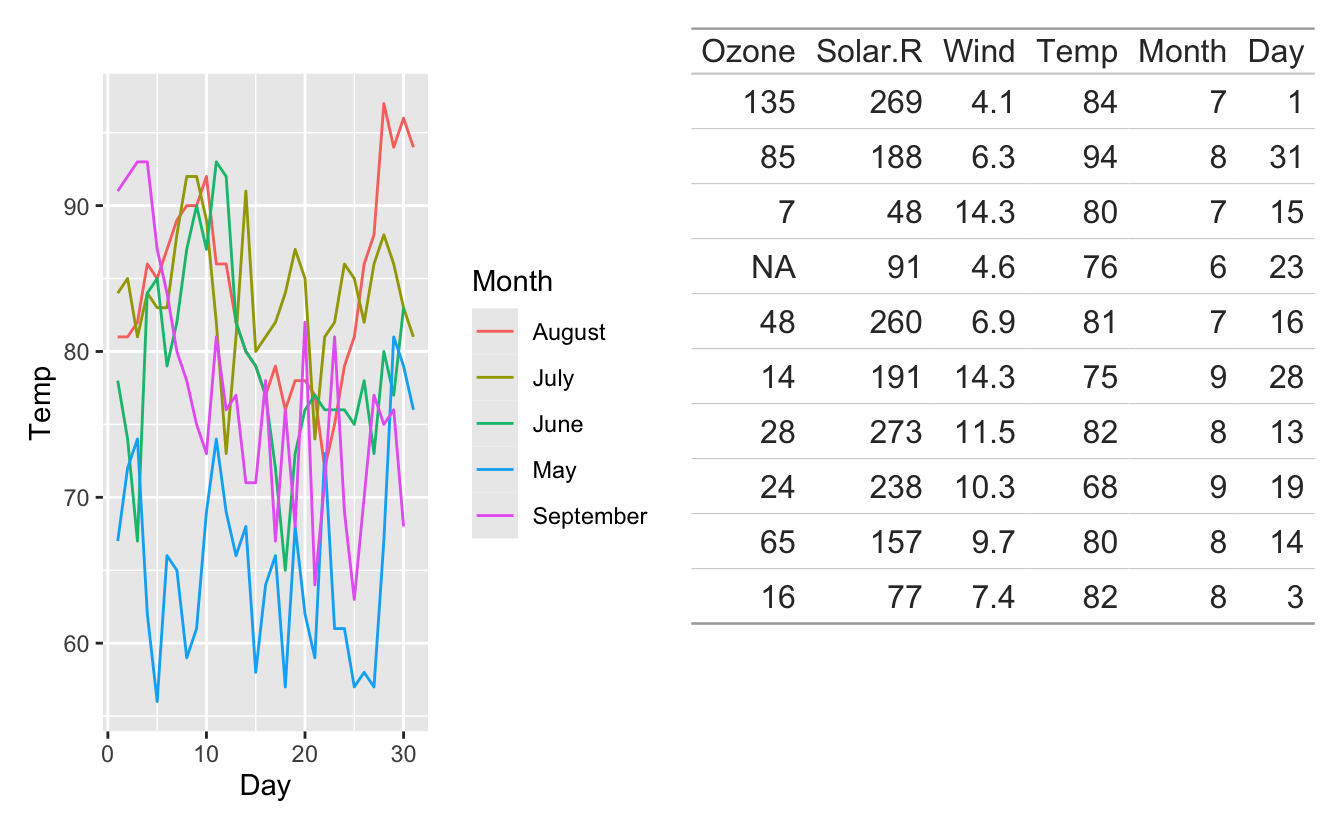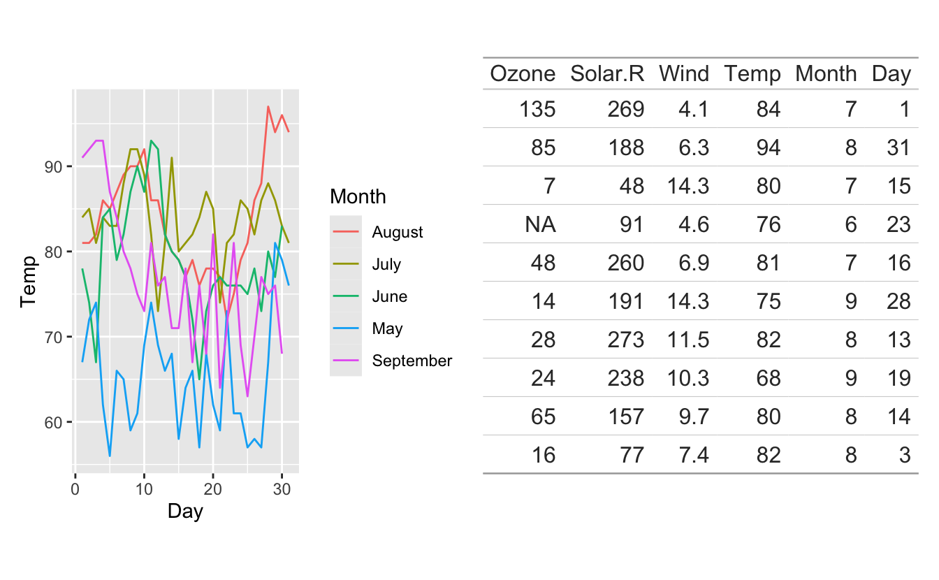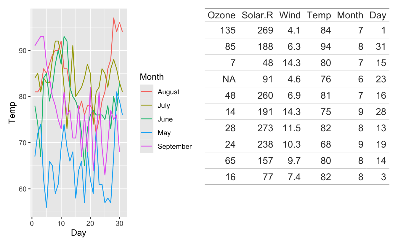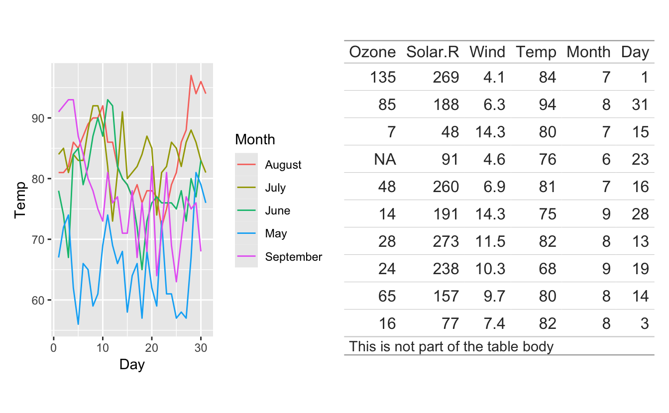 Lastly, we see that tables often have a fixed size, contrary to plots which can shrink and expand based on how much room they have. Because of this, our table is overflowing it’s region in the plot above creating a not-so-great look.